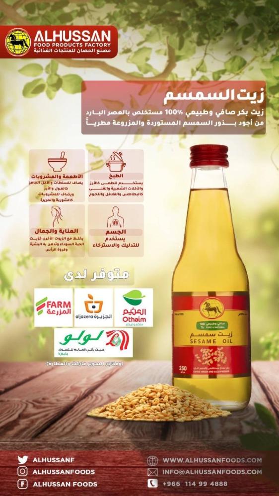 1. زيت السمسم (عصرة أولى): يُعرف بلونه الذهبي ونكهته ومذاقه الخاص المميز. هو خيارك الأفضل لإضافة لمسة سحرية للأطباق. وبفضل احتوائه على 82% من الأحماض الدهنية غير المشبعة، فهو المكون الأساسي لغذاء متوازن يدعم حيويتك يومياً.